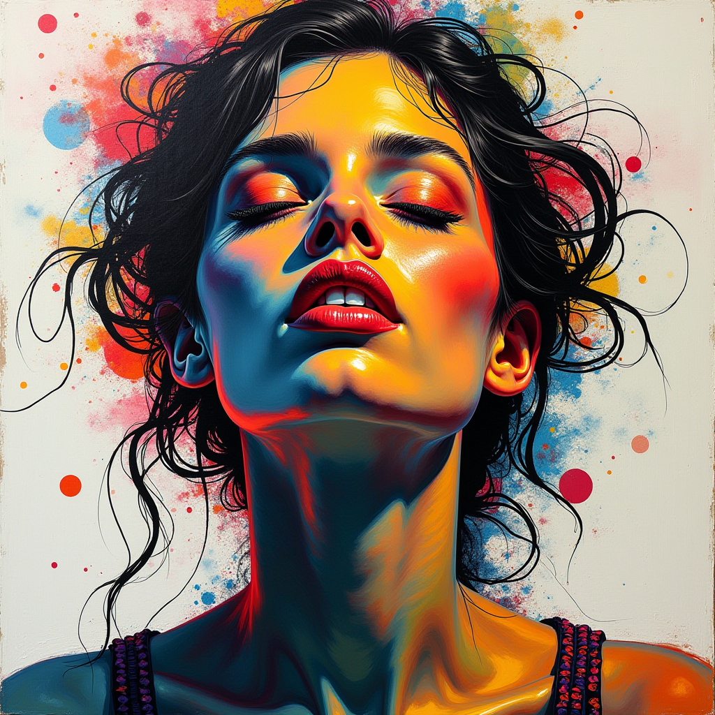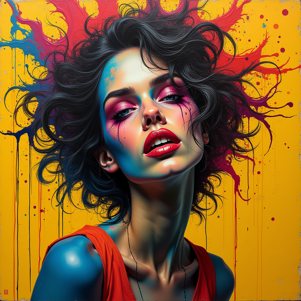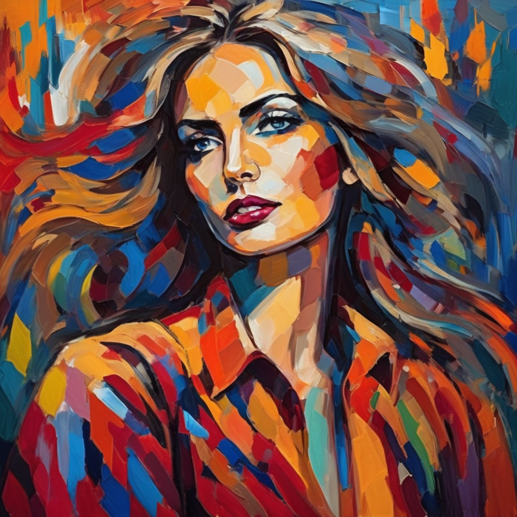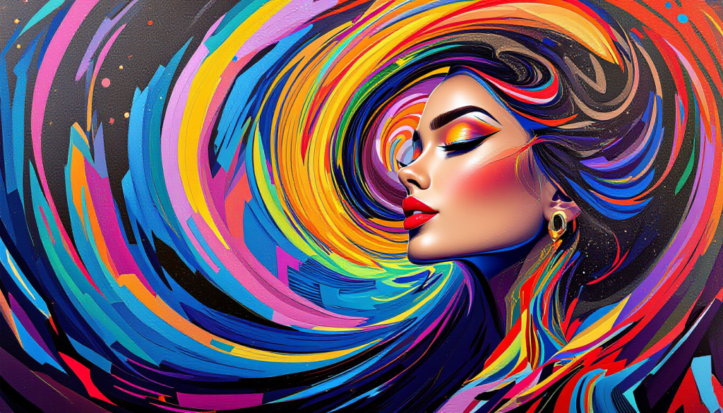 프롬프트: painting of a beautiful woman, dynamic, spiral pattern, distortion for emotional effect, vibrant, use of unusual colors, detailed