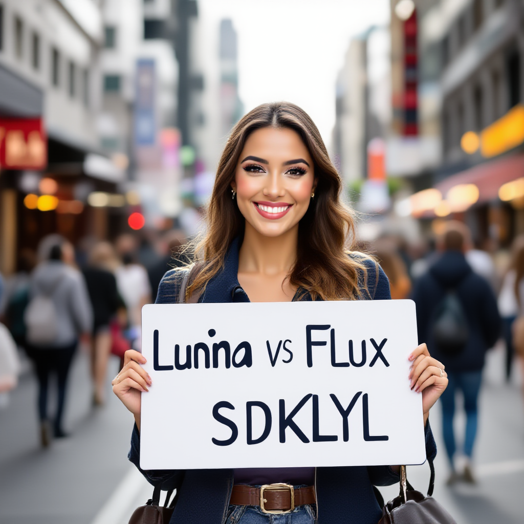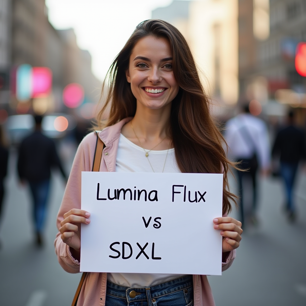 프롬프트: a portrait photo of a 25-year old beautiful woman, busy street street, smiling, holding a sign "Lumina vs Flux vs SDXL"