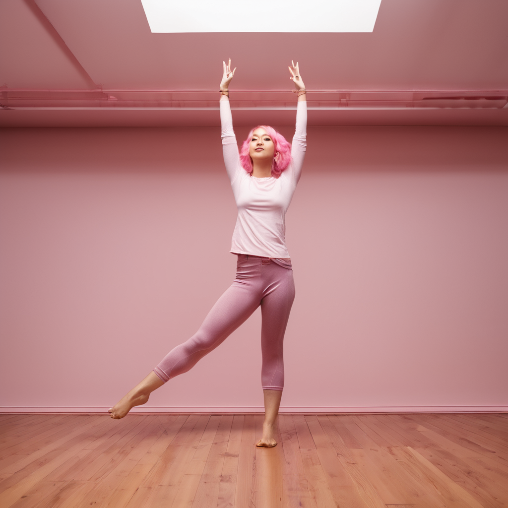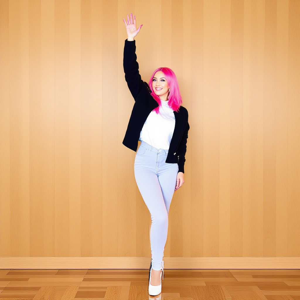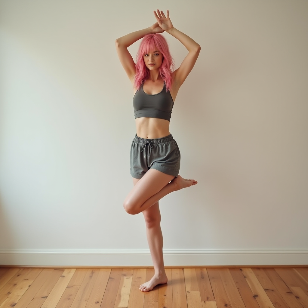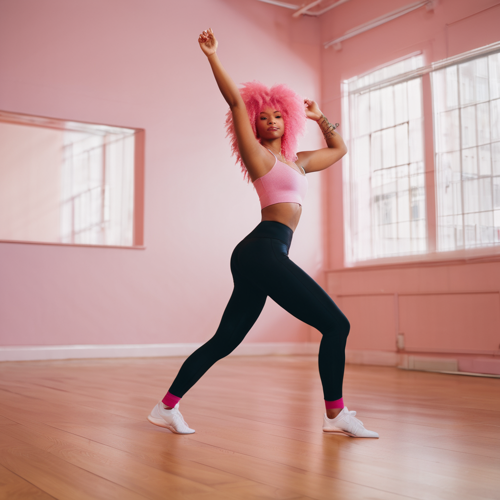 프롬프트: Photo of a woman with pink hair raising her left hand above her head. Stand with one leg on a hardwood floor.