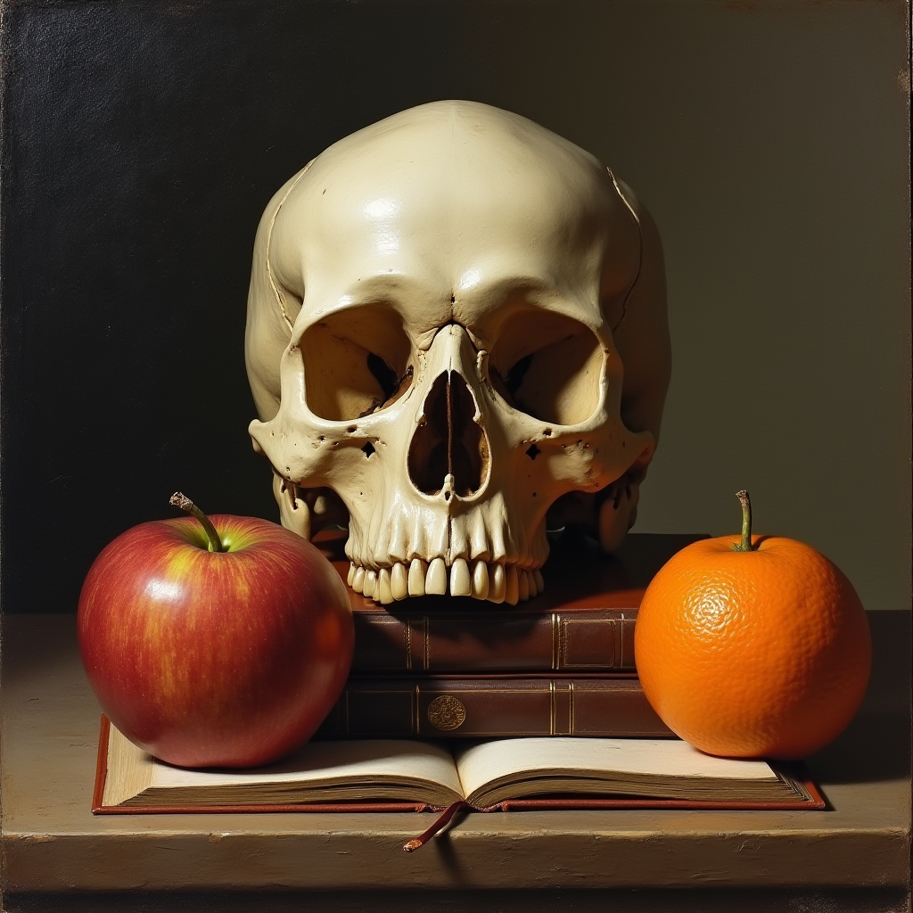 여기에 사용한 프롬프트는 이미지 생성 AI가 프롬프트를 어느정도 잘 따르는지를 테스트하기 위한 목적으로 여러번 사용했던 것입니다. 가운데에 해골과 책, 우측에 오렌지, 좌측에 사과가 있는 모습니다.