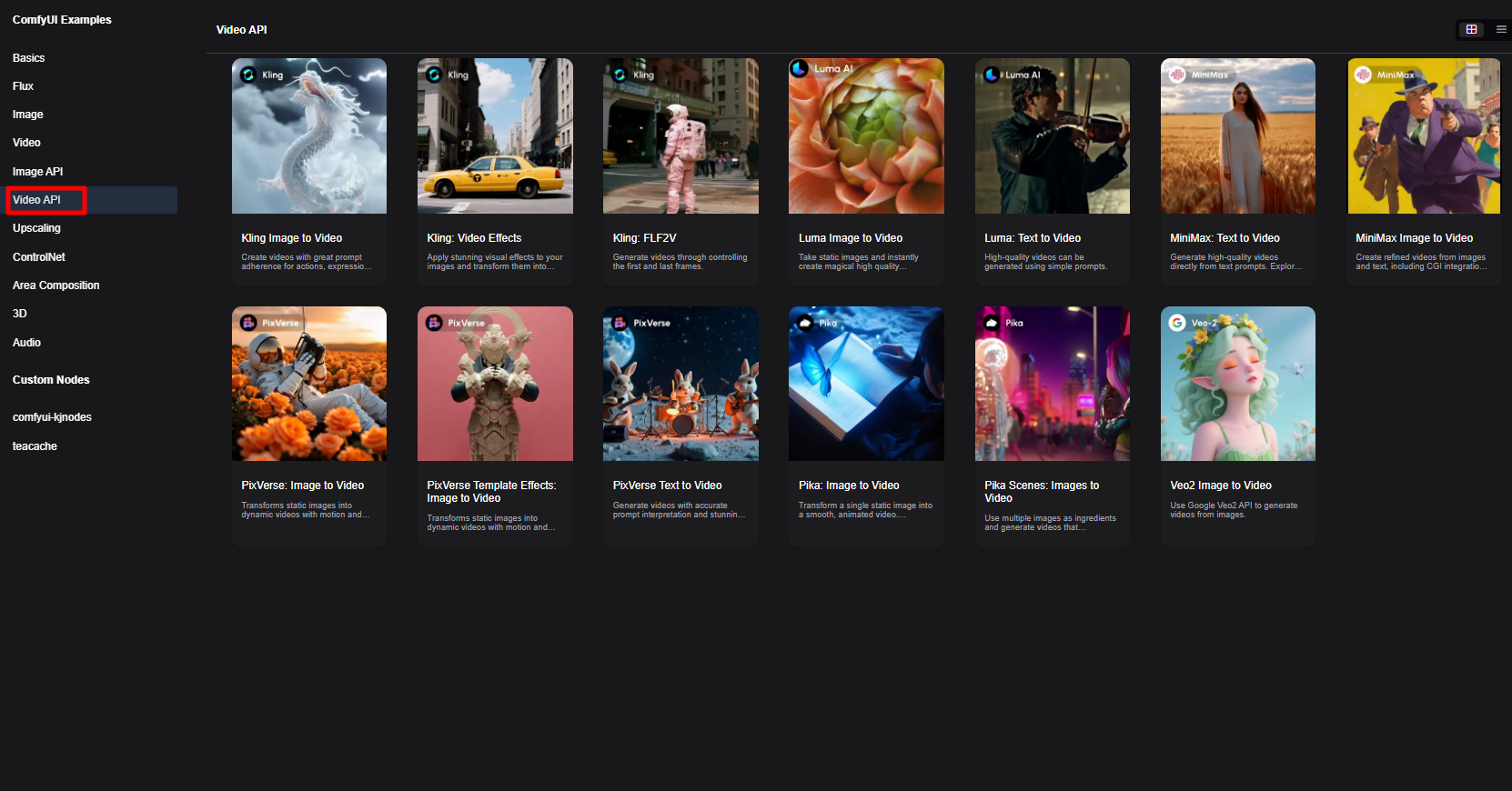 준비가 끝나면 메뉴에서 Workflow-> Browse Templates -> Image API 또는 Video API를 선택합니다.