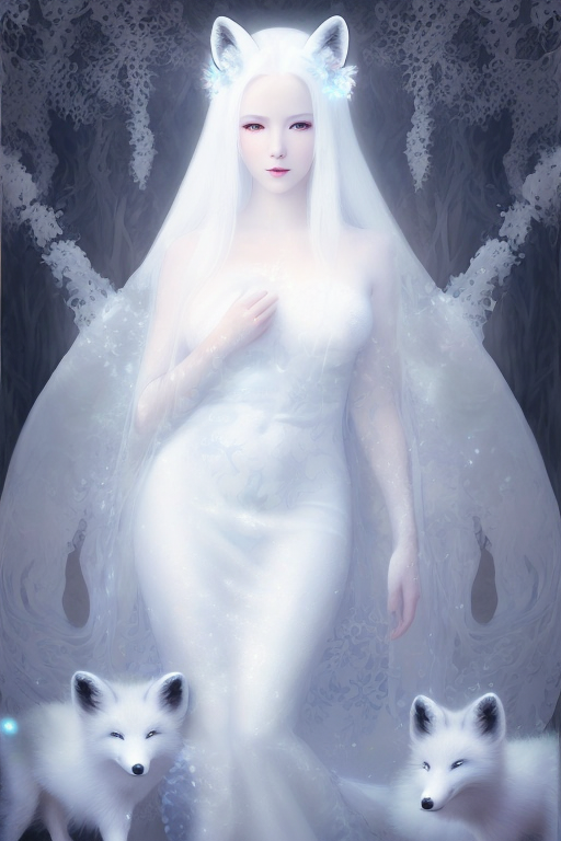 Full length oil painting of gorgeous woman as a translucent arctic fox spirit| detailed face| wearing white dress| straight white hair| mythical| elegant| hyperrealism| highly detailed| intricate detailed| volumetric lighting| Ukiyo-E| by Anne Stokes and Noriyoshi Ohrai |