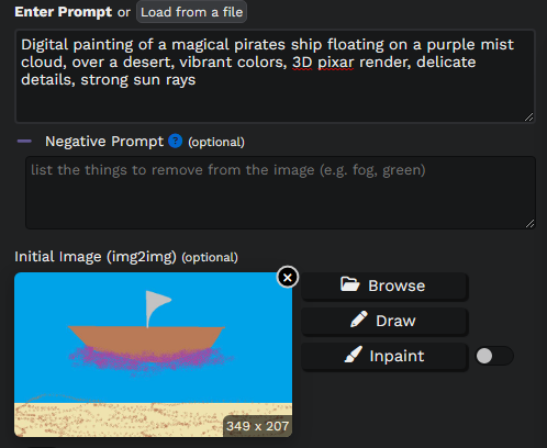 아래는 입력한 그림과 프롬프트"Digital painting of a magical pirates ship floating on a purple mist cloud, over a desert, vibrant colors, 3D pixar render, delicate details, strong sun rays"를 사용해 생성한 그림중 2개만 올린 것이다. 정말 그럴 듯하다. ㅎㅎ