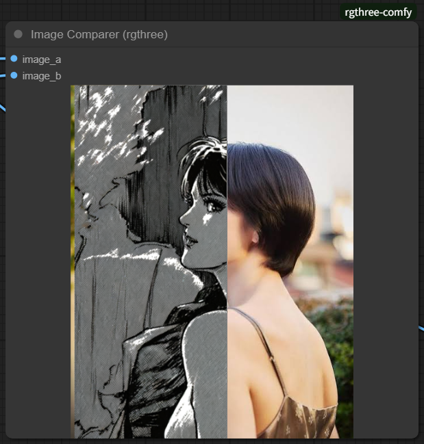 이제 [Run] 버튼을 누르면 이미지가 생성됩니다. 생성된 이미지는 위쪽에 있는 [Image Compare(rgthree)]노드를 사용해 비교해 볼 수도 있습니다.