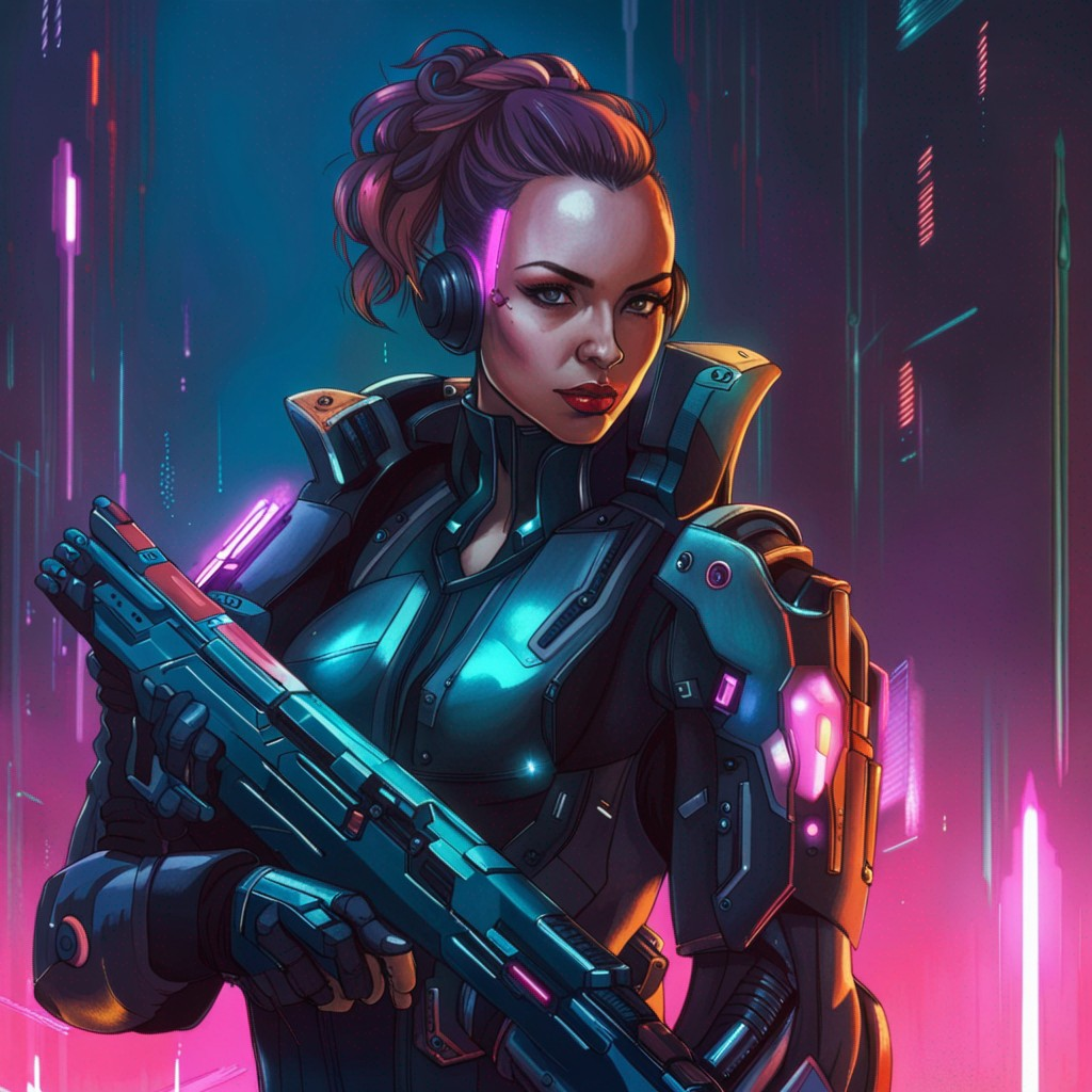 프롬프트 : a woman in a futuristic suit holding a gun in her hand, looking at the camera, cyberpunk art, neo-figurative, anime