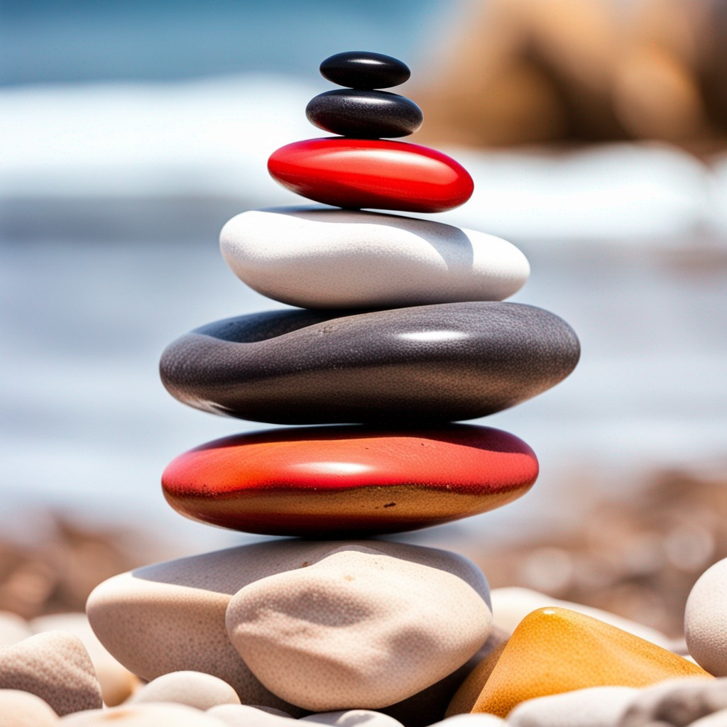 프롬프트 : a beautiful stack of rocks sitting on top of a beach, a picture, red black white golden colors, chakras, packshot, stock photo