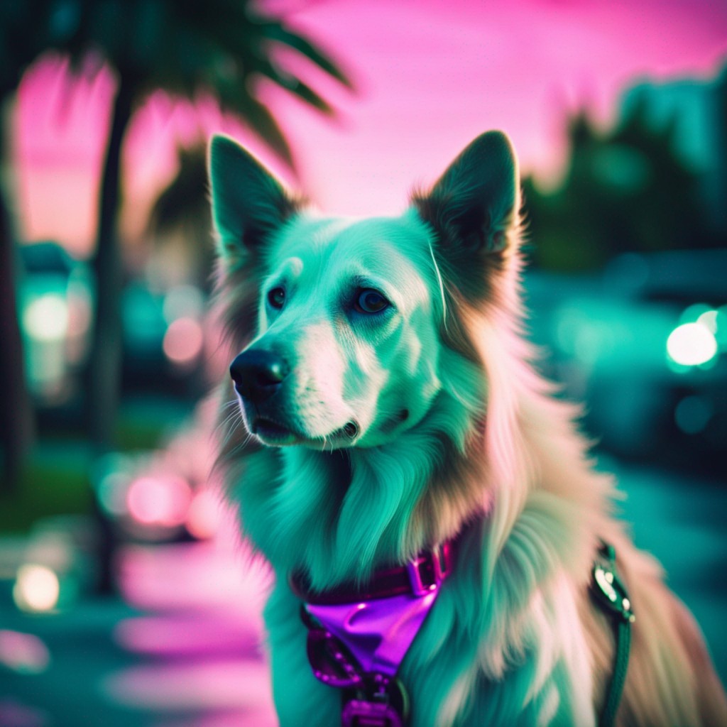아래는 생성된 결과입니다. 한 4-5분 정도 걸린 것 같네요. 프롬프트는 "Shot of Vaporwave fashion dog in miami" 입니다. vaporwave는 전자음악 서브장르인가본데, 이미지로 검색해보면 아래처럼 연보라 쪽 형광색을 기본으로 하는 이미지 쪽인 것 같네요.