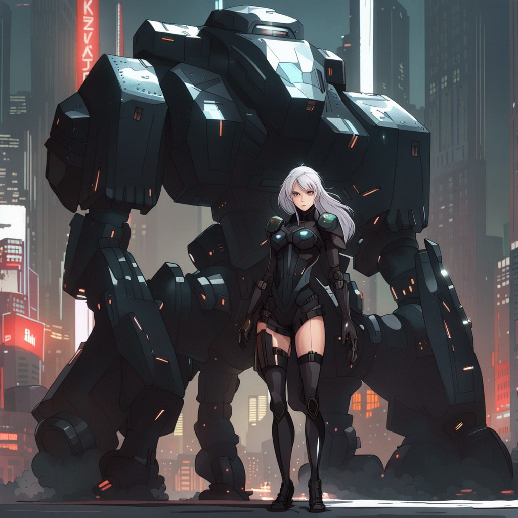 프롬프트: a woman with black armored uniform, futuristic, giant robot, inspired by Krenz Cushart, neoism, kawacy, wlop, gits anime