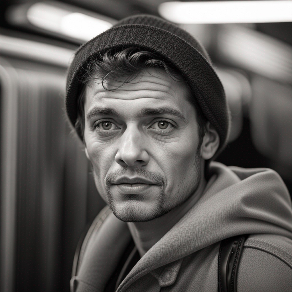 프롬프트: b&w photography, model shot, man in subway station, beautiful detailed eyes, professional award winning portrait photography, Zeiss 150mm f/2.8, highly detailed glossy eyes, high detailed skin, skin pores