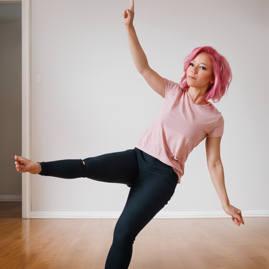 프롬프트: Photo of a woman with pink hair raising her left hand above her head. Stand with one leg on a hardwood floor.