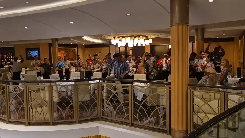 아래는 정찬시간에 열린 파티입니다. 정확한 파티 이름은 모르지만, 그날은 모든 웨이터들이 하와이안 셔츠를 입고 서빙을 했고, 식사를 하기전 10분정도 음악에 맞춰 춤을 췄습니다. 손님들은 모두 박수를 쳤고요. 이렇게 가끔씩 열리는 승무원들이 크루즈 승객들을 위한 서비스도 있습니다.^^