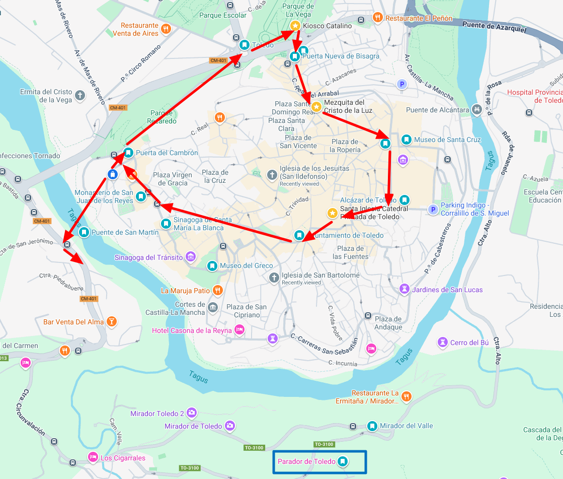 동선은 아래와 같습니다. 좌측 끝에 있는 아이콘이 저희 숙소입니다. 그리고 아래쪽에 있는 파란 박스는 다음날 방문한 호텔(전망대)입니다. 대략 숙소에서 비사그라의 문, 소코도베르 광장, 톨레도 성당을 거쳐 숙소로 돌아왔다가 산 마르틴 다리로 마실 나가는 일정이었습니다.