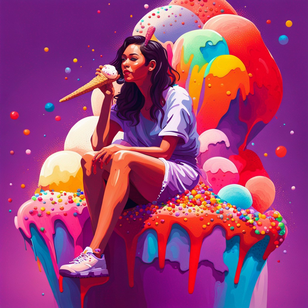 프롬프트: A woman sitting on a giant ice cream, which is adorned with vibrant colors, delightful, and rainbow sprinkles. sweetness and joy, happiness, enchanting fusion, imagination and a fantastical world,fantasy, high contrast, ink strokes, explosions, over exposure, purple and red tone impression, abstract, negative space