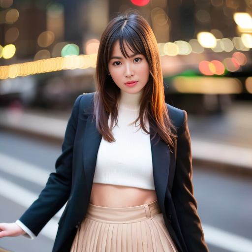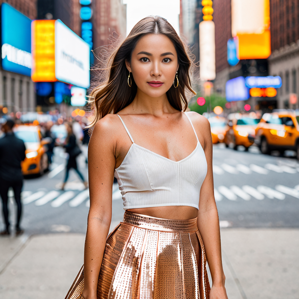 프롬프트: photo of a 25 year old woman, new york city standing, skirt, looking at the camera, dslr, ultra quality, sharp focus, tack sharp, dof, film grain, Fujifilm XT3, crystal clear, 8K UHD, highly detailed glossy eyes, high detailed skin, skin pores