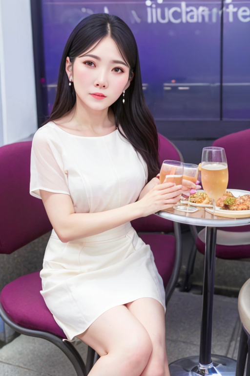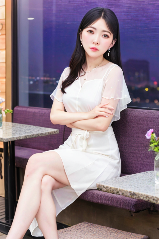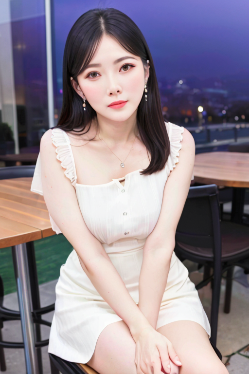 프롬프트: photo of young woman, highlight hair, sitting outside restaurant, wearing dress, rim lighting, studio lighting, looking at the camera, dslr, ultra quality, sharp focus, tack sharp, dof, film grain, Fujifilm XT3, crystal clear, 8K UHD, highly detailed glossy eyes, high detailed skin, skin pores