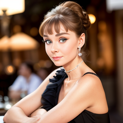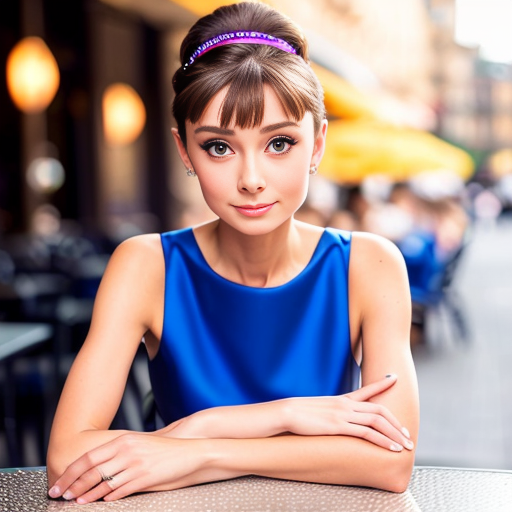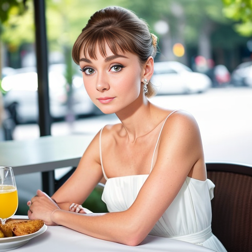 프롬프트: Audrey Hepburn, photo of young woman, highlight hair, sitting outside restaurant, wearing dress, rim lighting, studio lighting, looking at the camera, dslr, ultra quality, sharp focus, tack sharp, dof, film grain, Fujifilm XT3, crystal clear, 8K UHD, highly detailed glossy eyes, high detailed skin, skin pores