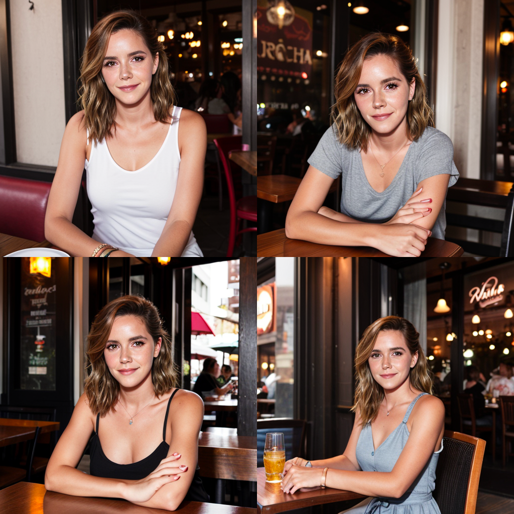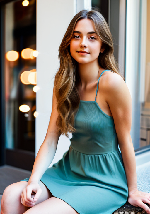 프롬프트: A woman sitting outside of a restaurant in casual dress