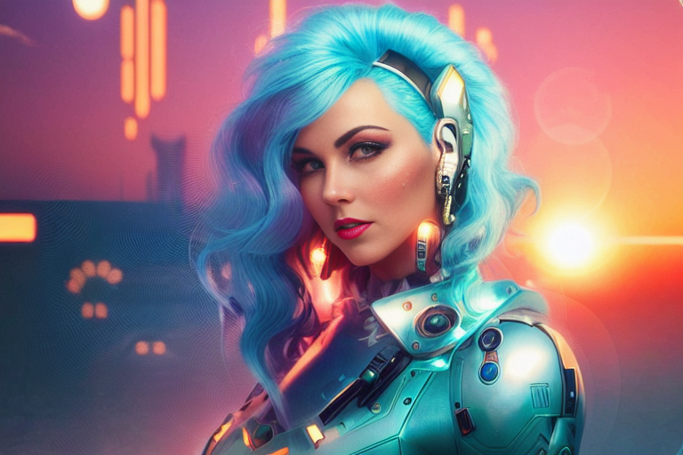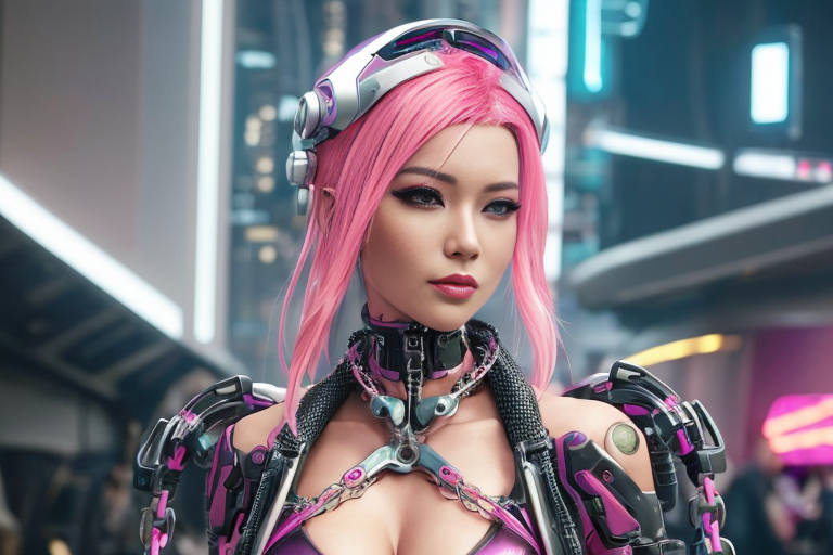 프롬프트: a woman with pink hair and a futuristic suit with chains on her head and a sci - fi filament on her face, Artgerm, cyberpunk style, cyberpunk art, retrofuturism