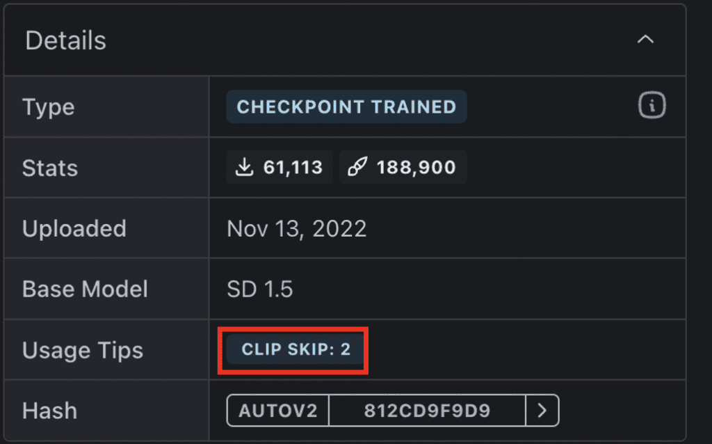일부 모델의 경우 CLIP Skip 설정을 다른 값으로 설정할 것을 권하는 경우가 있습니다. 이런 경우, 해당 모델에서 의도한 효과가 나타나도록 하려면 이 설정을 따르는 것이 좋습니다.