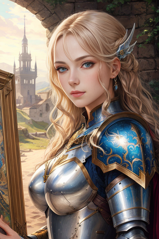 프롬프트: portrait of a woman in light armor, burst shot, detailed eyes, a detailed painting, fantasy art <lora:more_details:0.3>