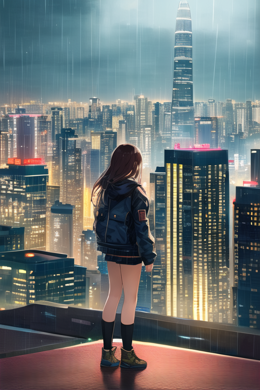 프롬프트: a young girl standing on a rooftop, looking at a city at night, turned away, buildings and lights in the background, a rain falling down, Hongkong, cyberpunk art, highly detailed, UHD