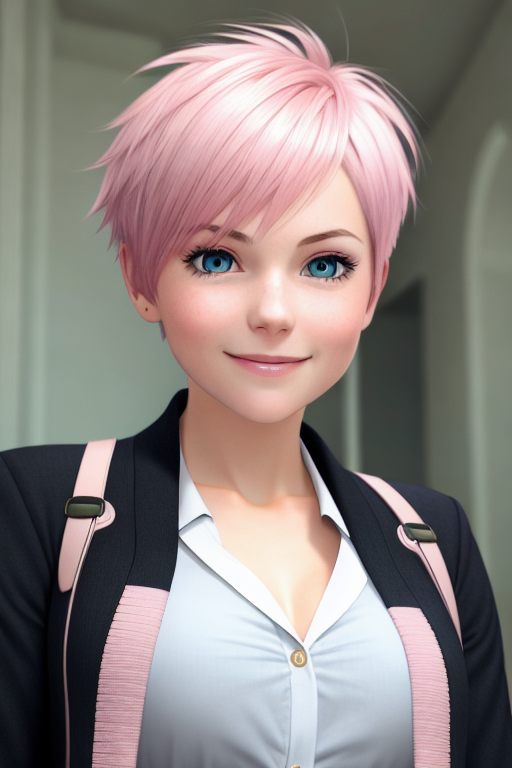 프롬프트: RAW portrait photo of beautiful detailed girl, light smile, extremely detailed eyes and face, short bang, pink hair, floating hair, long eyelashes, looking at viewer, 1girl, cute, young, mature face, small breasts, business suit, collared shirt, in office, open cardigan, black thighhighs, miniskirt, unbuttoned shirt, best quality, photo-realistic, masterpiece, CG, unity, 8k wallpaper, highres, absurdres, soft light, lim lighting (ChilloutMix 예제와 동일)