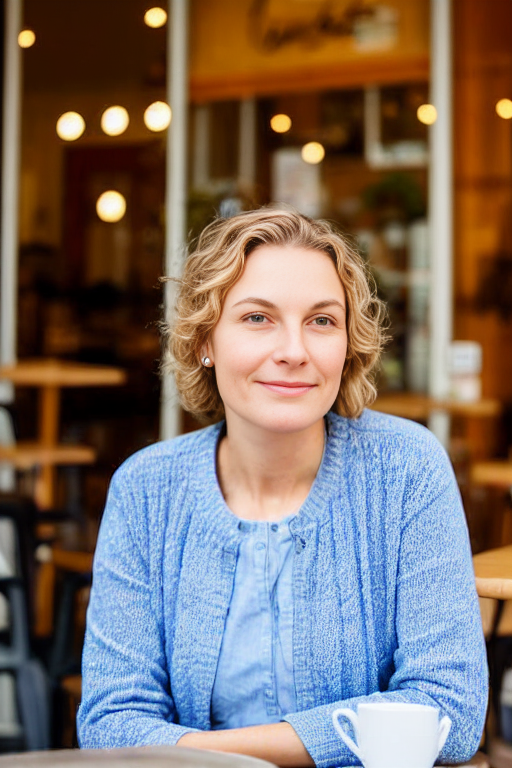 프롬프트: a photo of a woman, sitting in front of cafe, burst shot, detailed face, looking at me, 8K, UHD