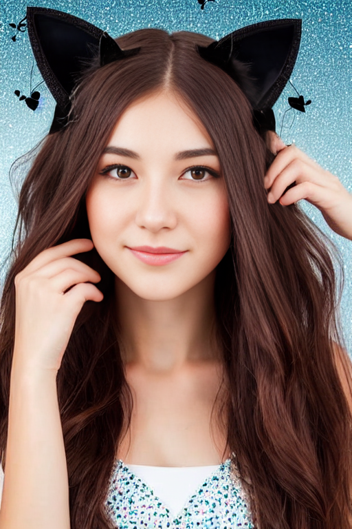 프롬프트: portrait of a beautiful young woman, cat ears, dress, burst shot, detailed face, looking at me, 8K, UHD