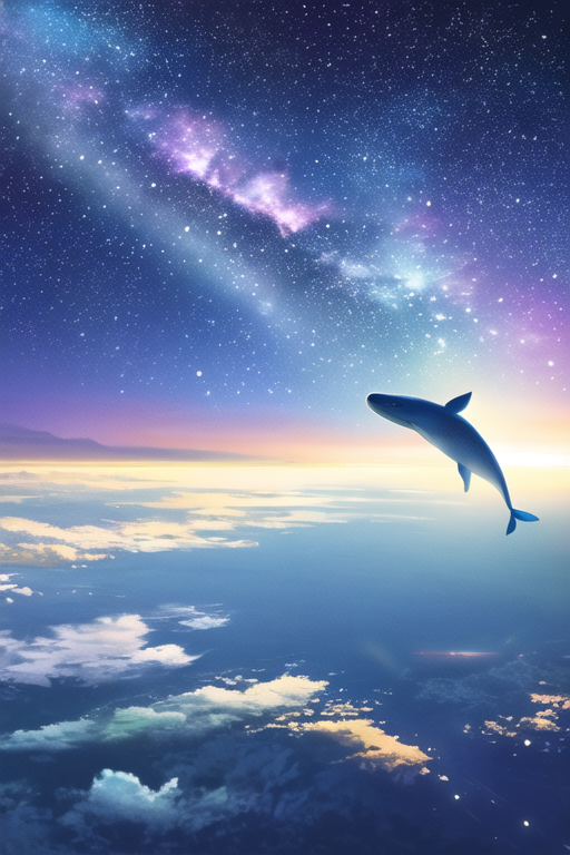 프롬프트: scenery, whale in the starry sky, swimming fishes, galaxy, cosmos, fantasy, floating object, backlight, shadow, masterpiece, best quality