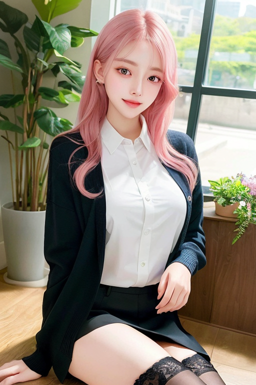프롬프트: RAW portrait photo of beautiful detailed girl, light smile, extremely detailed eyes and face, short bang, pink hair, floating hair, long eyelashes, looking at viewer, 1girl, cute, young, mature face, small breasts, business suit, collared shirt, in office, open cardigan, black thighhighs, miniskirt, unbuttoned shirt, best quality, photo-realistic, masterpiece, CG, unity, 8k wallpaper, highres, absurdres, soft light, lim lighting, ulzzang-6500-v1.1 <lora:koreanDollLikeness:0.3> <lora:japanesedolllikenessV1_v15:0.2>