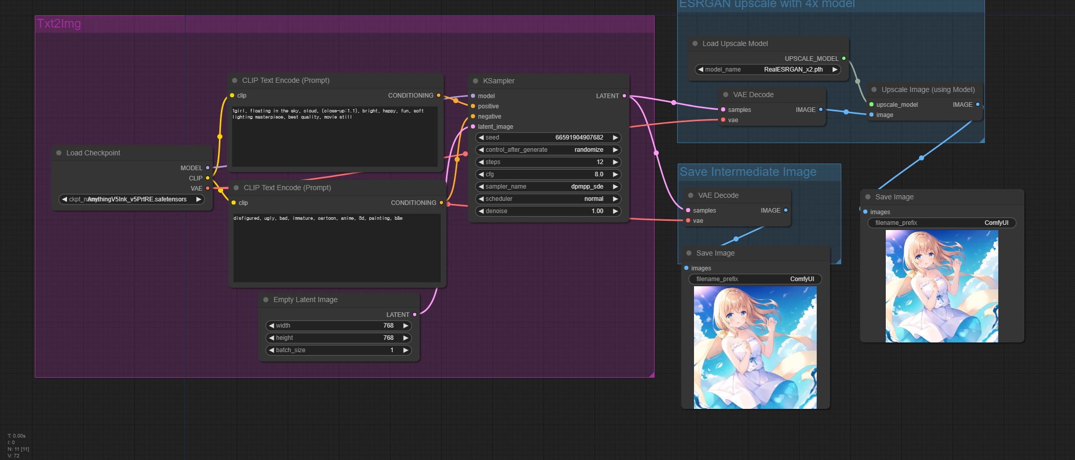 보라색에 있는 워크플로는 ComfyUI를 한번이라도 사용해 봤다면 구지 설명할 필요가 없을 정도로 매우 익숙한 기본 Txt2img 워크플로입니다.