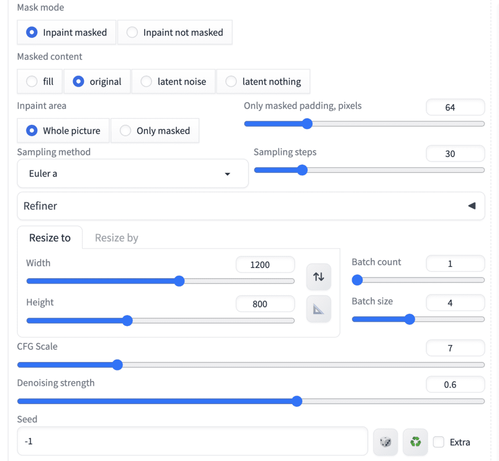 다음으로 Img2img 페이지로 들어가서 Inpaint 탭을 누른후 아래와 같이 설정합니다.