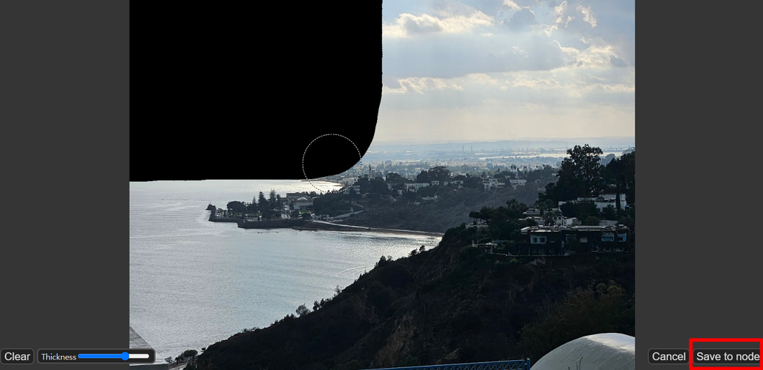 그러면 아래와 같은 화면이 나오는데, 왼쪽아래의 Thickness를 사용해 마스크 브러시 크기를 조정하여 그려준뒤 맨 마지막에 오른쪽아래 [Save to node]를 클릭해주면 됩니다.