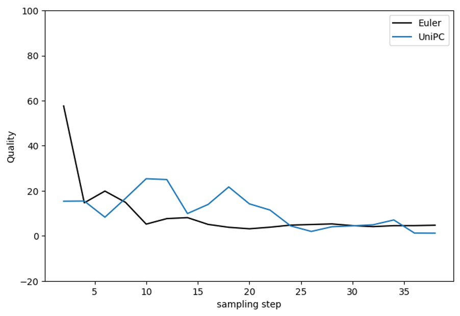 UniPC는 Euler에 비해 약간 느리게 수렴되지만, 그다지 나쁜 편은 아닙니다.