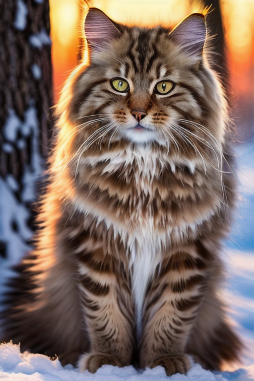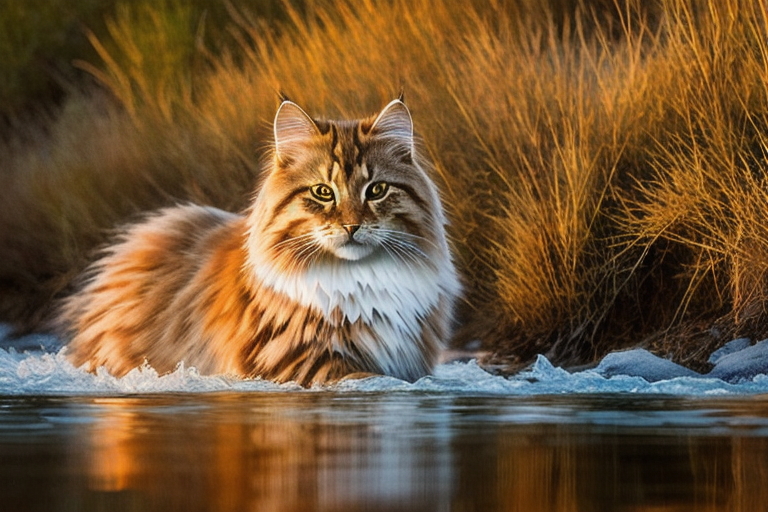 프롬프트: National Geographic Wildlife photo of the year, siberian cat on river, evening light, sunset, rim lighting, depth of field