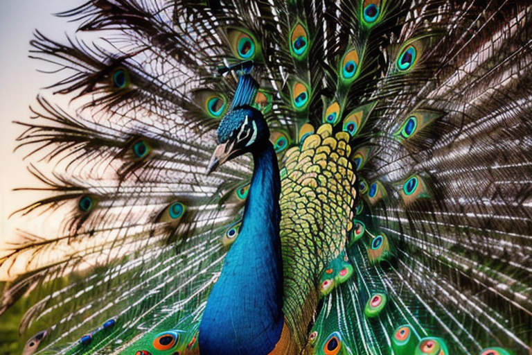 프롬프트: National Geographic Wildlife photo of the year, Peacock with feathers spread wide, wilderness, evening light, sunset, dramatic lighting