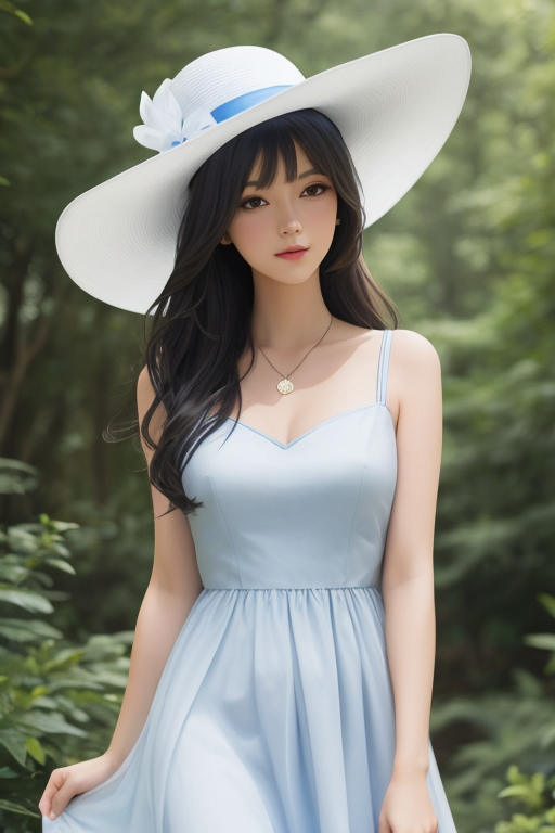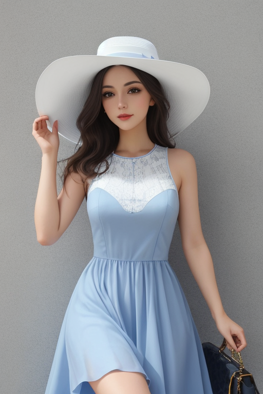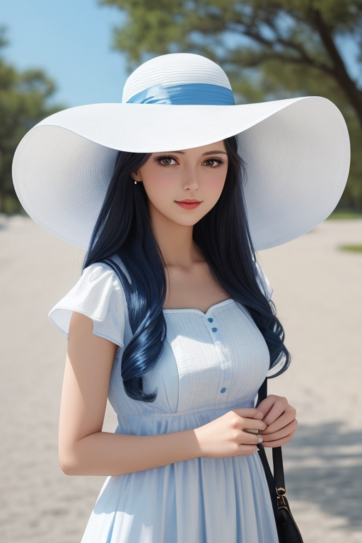 그런데... 직접 해보시면 색이 섞이는 경우가 많습니다. 위의 이미지 들도 모자의 밴드가 청색으로 되어 있는 게 이런 효과 때문입니다. 이런 미묘한 프롬프트 처리는 DALL-E 3가 최고라고 합니다. 아래는 " photo of a woman in white hat and blue dress" 로 그린 결과입니다. 머... 그런데 모자 밴드가 청색이 되는 건 비슷하네요. ㅎㅎ
