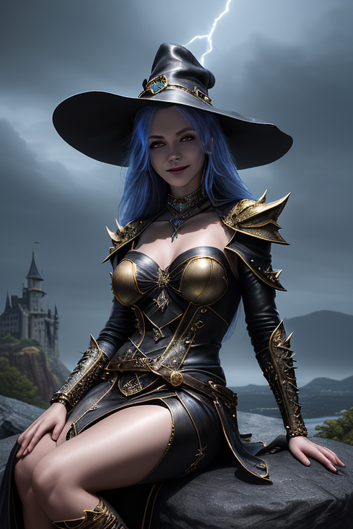 프롬프트: a beautiful and powerful mysterious sorceress, smile, sitting on a rock, lightning magic, hat, detailed leather clothing with gemstones, dress, castle background