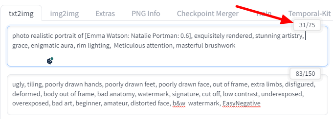 AUTOMATIC1111 GUI에서는 토큰의 수를 직접 확인할 수 있ㅅ브니다. 예를 들어, 바로 위의 이미지를 생성하는 데 사용되었던 프롬프트는 대략 23개 정도의 단어로 이루어져 있는데, 아래 그림에서 볼 수 있는 것처럼 토큰의 수는 31개로 표현되어 있습니다.