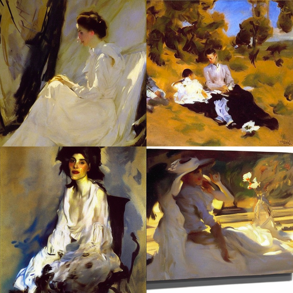 아래는 John Singer Sargent을 SD v1.5 모델에 넣어서 생성한 결과입니다.