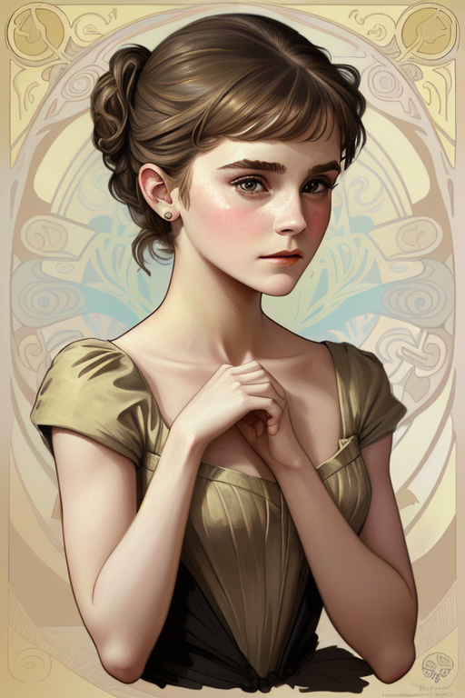 프롬프트: digital painting of [Emma Watson: Audrey Hepburn : 0.6] by Alphonso Mucha