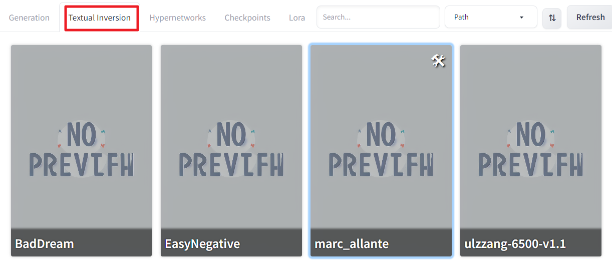 이렇게 임베딩 파일명을 직접 입력하는 대신, AUTOMATIC1111 GUI에서 클릭하는 방식이 더 좋습니다. 아래와 같이 txt2img 혹은 img2img 페이지에서 Textual Inversion 탭을 연뒤 원하는 인베딩을 선택해 주면 됩니다. 클릭하는 즉시 프롬프트에 해당 내용이 나타나거나 사라집니다.