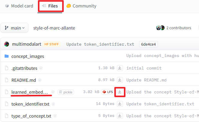 만약 Concept Libray에서 다운로드 받을 경우 임베딩이름이 learned_embedds.bin으로 되어 있는데(아래 빨간 선), 이것을 우클릭해서 다운로드 받으면 안됩니다(웹페이지가 다운로드 됩니다). 그 파일명을 클릭하거나, 오른쪽에 있는 아래쪽 화살표를 클릭하면 다운로드 받을 수 있습니다.