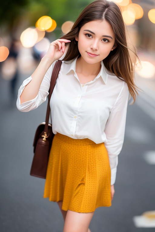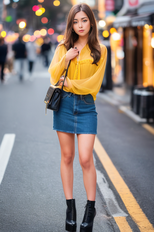 프롬프트: full body photo of young woman, natural brown hair, yellow blouse, blue dress, busy street, rim lighting, studio lighting, looking at the camera, dslr, ultra quality, sharp focus, tack sharp, dof, film grain, Fujifilm XT3, crystal clear, 8K UHD, highly detailed glossy eyes, high detailed skin, skin pores