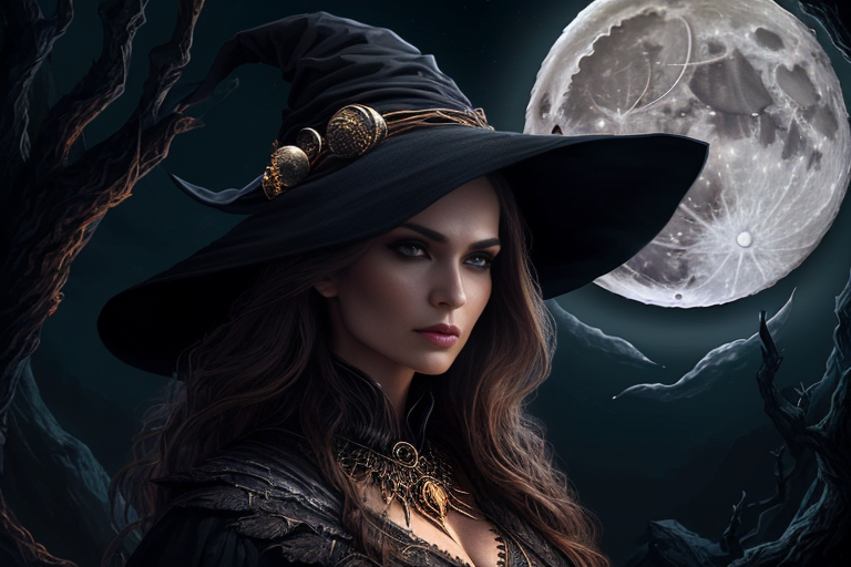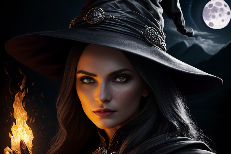 프롬프트: a witch, highly detailed face, half body, studio lighting, dramatic lighting, highly detailed clothing, looking at you, mysterious, dramatic lighting, (full moon:1.3), (beautiful fire magic: 1.2)