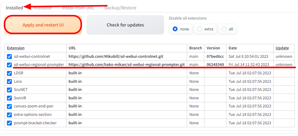 4. 이제 Installed 탭으로 이동하면 아래와 같이 regional prompter 확장이 설치되어 있습니다. 여기에서 [Apply and restart UI] 버튼을 누르고 잠시 기다리면 설치가 완료됩니다.