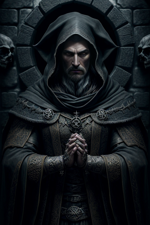 프롬프트: a mysterious wizard , highly detailed face, highly detailed clothing, cinematic, dark, horror, worn stone wall, ancient symbol, old mystical torn scroll, wolf, many skulls
