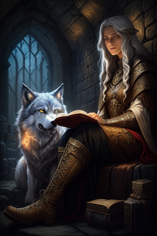 프롬프트: a mysterious wizard studying old mystical torn scroll, highly detailed face, highly detailed clothing, cinematic, dark, horror, worn stone wall, ancient symbol, wolf, many skulls