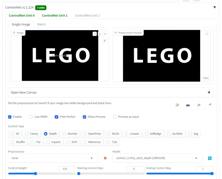1. 첫번째 ControlNet(Unit 0)에서는 방법 1에서 설정한 것과 동일하게 설정합니다.