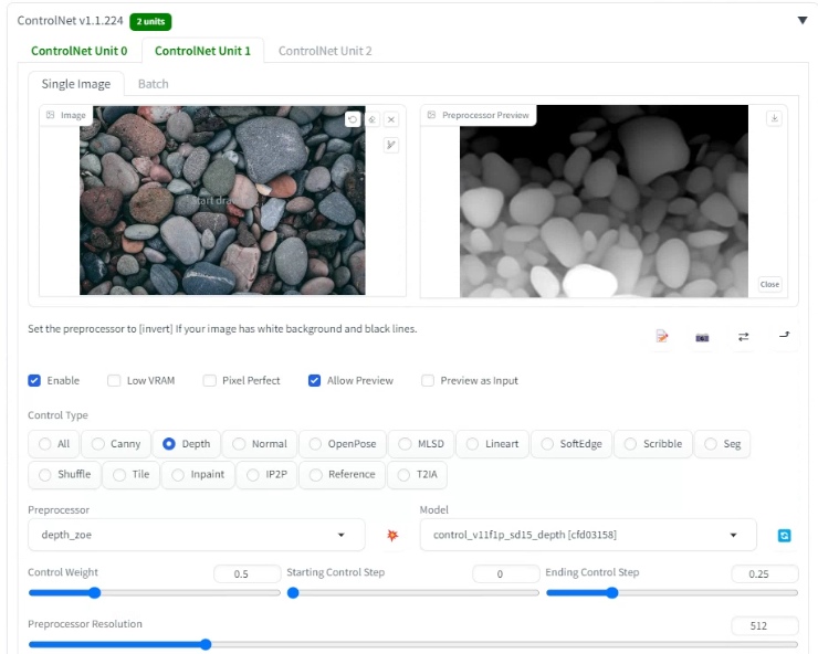 저는 아래와 같이 전처리기를 depth_zoe로 선택하는 것이 가장 좋아보였습니다.